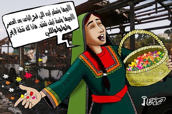 Auch bei palästinensischen Karikaturenzeichnern findet der Jubel über den Terroranschlag in Jerusalem seinen Niederschlag; rasch schlossen sie sich dem Chor derer an, die die "heldenhafte Operation" gegen israelische Zivilisten feierten. Eine von ihnen, Omayya Juha, reagierte schnell und zeichnete einen Cartoon, der eine palästinensische Frau zeigt, die den Terroranschlag feiert, indem sie vor Freude jauchzt und Bonbons verteilt.