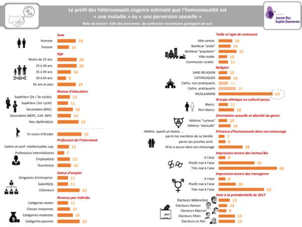 15,5 % der heterosexuellen Franzosen halten Homosexualität für “eine Krankheit” oder “eine sexuelle Perversion”, 63 % der Muslime sind dieser Meinung